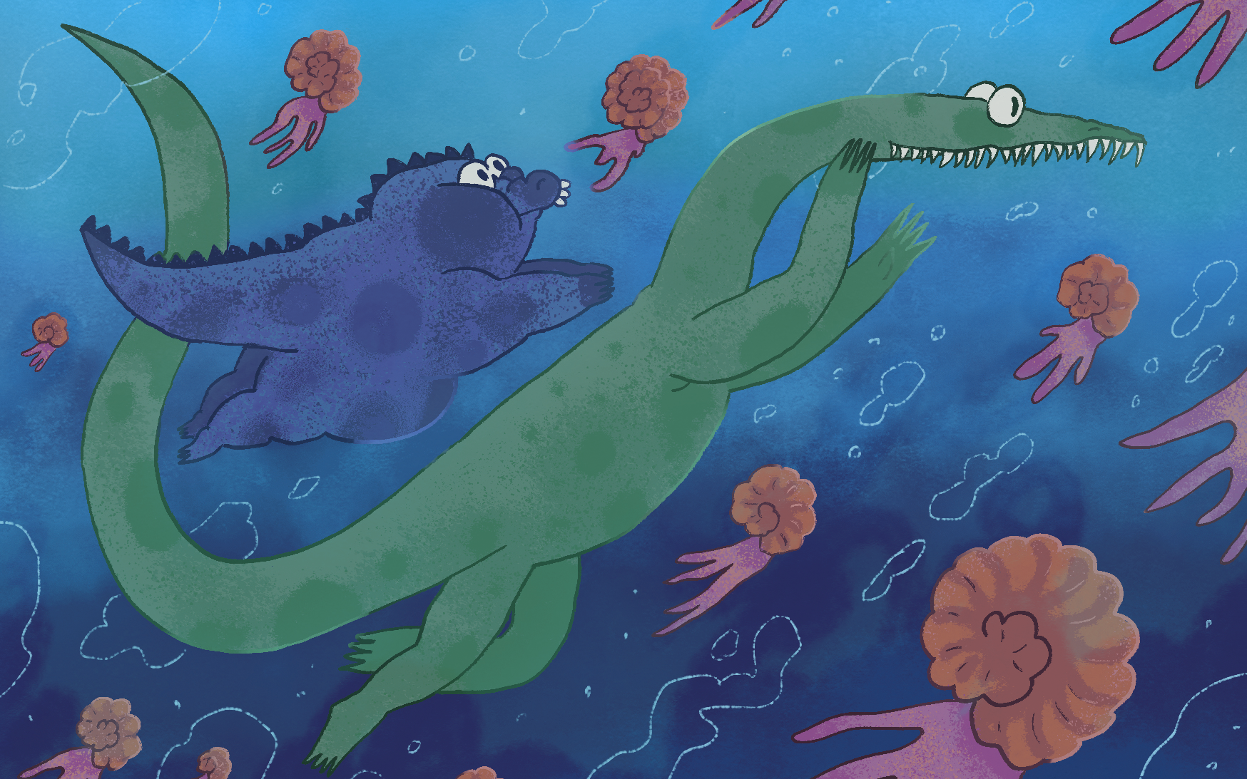 Die zwei Saurier Maskottchen aus dem Urwelt-Museum Oberfranken. Plax, der kleine dicke Placodus gigas und Basti, der lange grüne Nothosaurus mirabilis. Sie begleiten die kleinen Besucher*innen durch das ganze Museum.